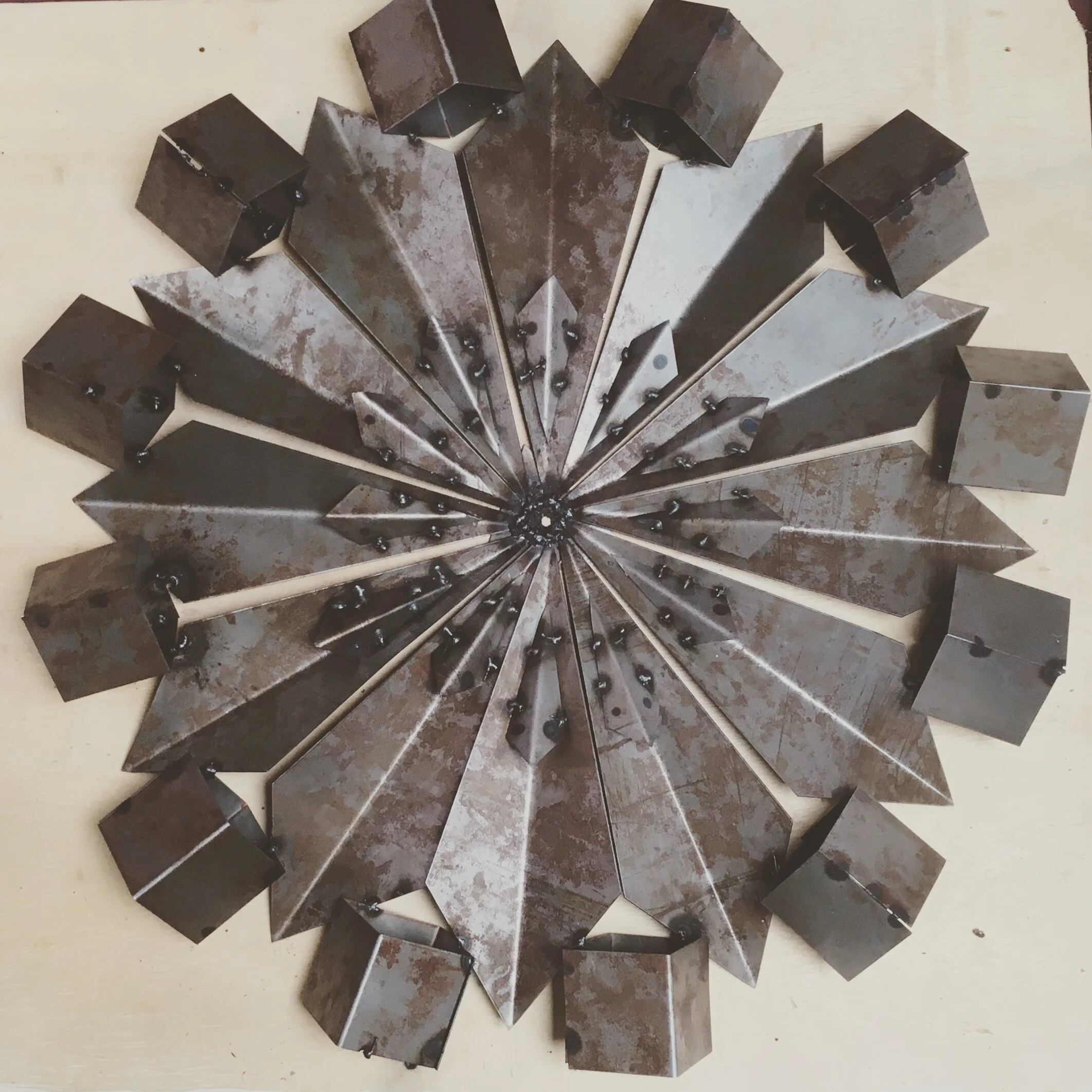 The idea of Quilter came from the image of barn quilts. Barn quilts started with Donna Sue Groves in 2001, as a gift to her mother and then quickly spread across the midwest. Each quilt is unique, filled with patterns and colors, as is each family of the barn they reside on. This piece combines the history and geometry of the typical barn quilt, with the industrialism of steal, and after some time rust. Like times effect on ones family, the effect of time is yet to be discovered.